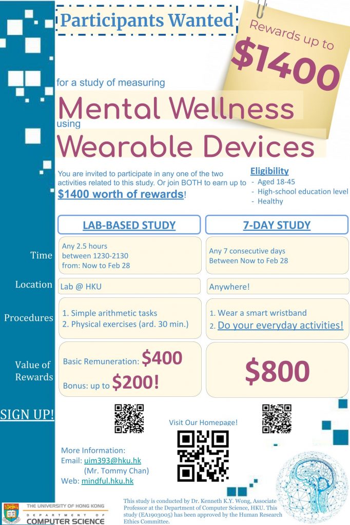 You are cordially invited to participate in a study related to mental wellness evaluation using Heart Rate Variability (HRV) measured by wearable devices (HREC Ref. No.: EA1903005). We are recruiting participants for two activities related to this study, namely Lab-based Study and 7-day Study. You may join any one of the two activities, or join both to receive up to HKD 1400 worth of rewards!